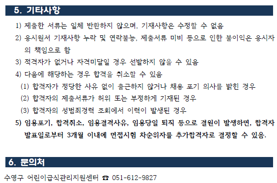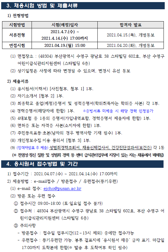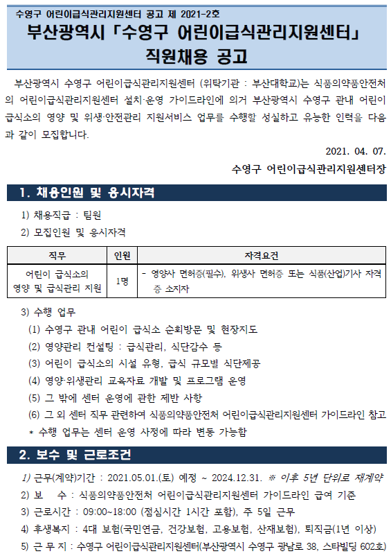 fnctId=bbs,fnctNo=2786 작성일 2021.04.07 수정일 2021.04.07 작성자 김소정 조회수 669 [식영/공통] 수영구 어린이급식관리지원센터 직원채용 공고 첨부파일 1-1채용 공고.pdf 미리보기 1-2. 첨부. 응시원서,자기소개서,개인정보동의서_수영구어린이급식관리지원센터.hwp 미리보기